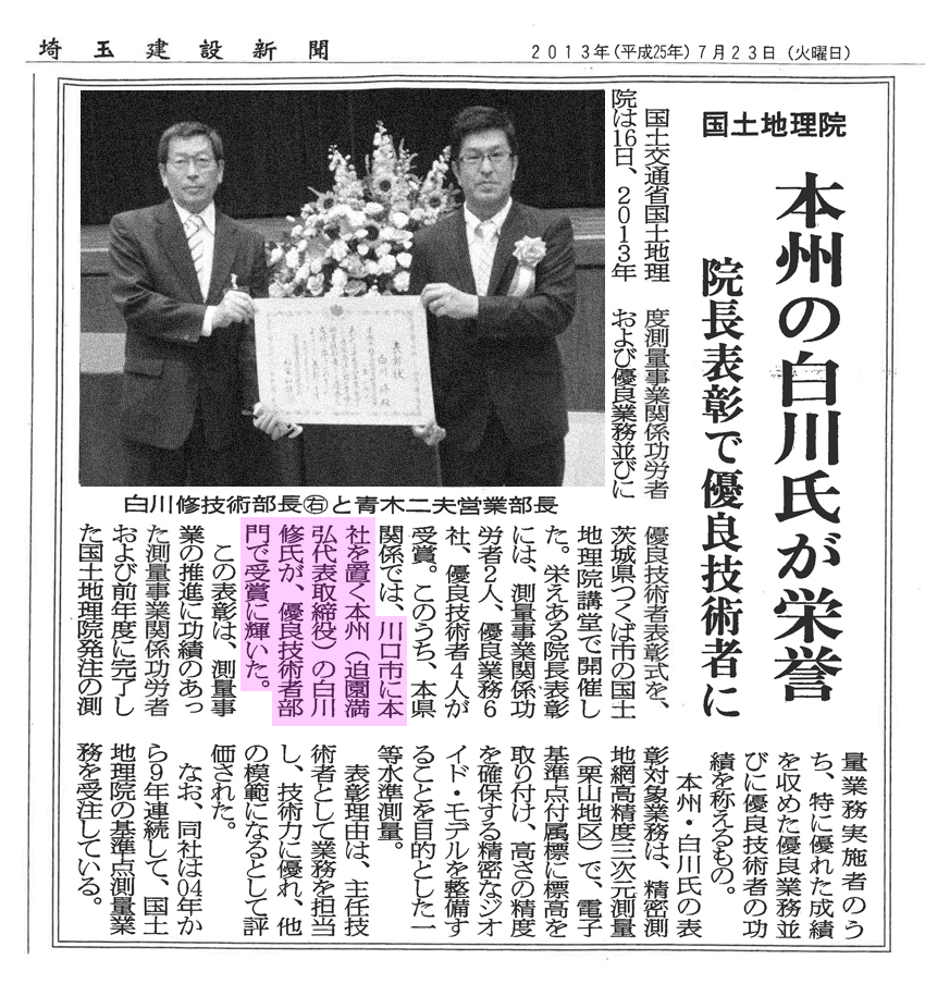 | 2013年7月16日 | 国土地理院優良技術者表彰受賞 |